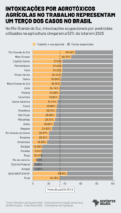 Os números, compilados pelo Sinan (Sistema de Informação de Agravos de Notificação), mostram ainda que, desde 2015, o país somou 73.391 intoxicações por agrotóxicos. A série teve queda em 2020, mas voltou a subir a partir do ano seguinte. A análise considera apenas os chamados “casos não intencionais”, excluindo suicídios, abortos, homicídios e outros episódios em que a contaminação foi deliberada.