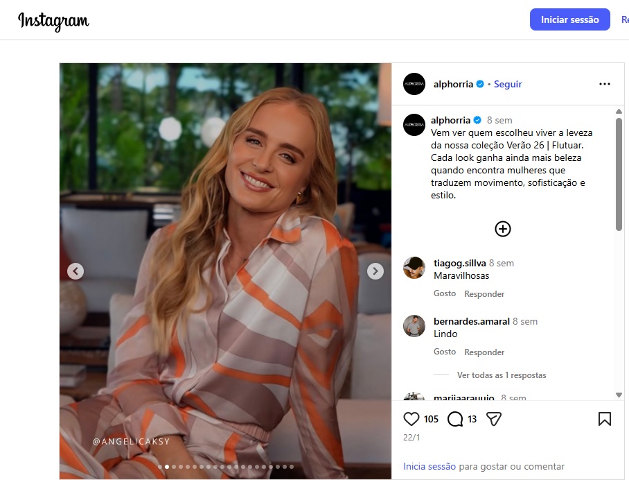 Angélica e Ticiane Pinheiro aparecem entre as celebridades que usam as roupas da Alphorria em um post nas redes sociais da marca divulgando a sua coleção verão 2026. A Repórter Brasil procurou ambas as apresentadoras, mas não obteve respostas até o fechamento da reportagem. O espaço ficará disponível para futuras manifestações.