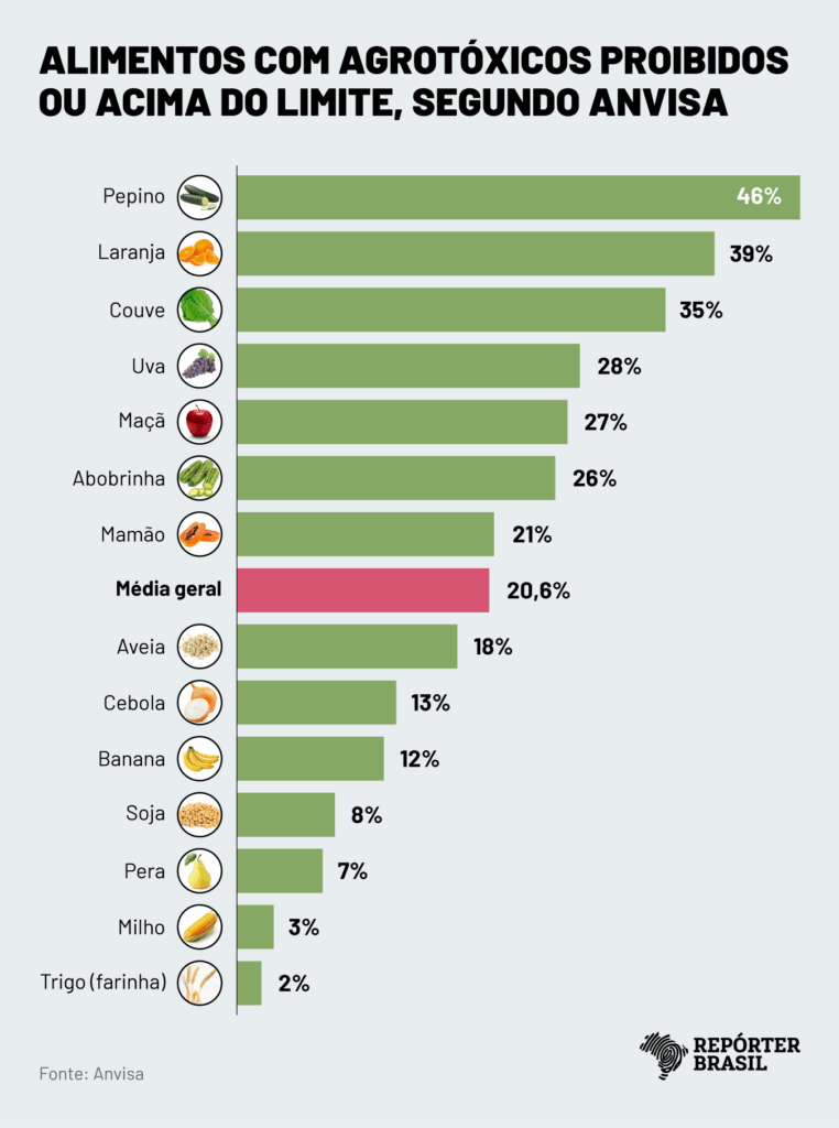 Entre os problemas identificados, 12% do total de amostras tinham resíduos de agrotóxicos não permitidos para a cultura analisada; 5,6% apresentaram resíduos acima do limite permitido; e 0,1% continham substâncias proibidas no Brasil. As demais amostras foram consideradas satisfatórias: em 26% não houve detecção de resíduos e, em 54%, foram encontrados agrotóxicos nos alimentos, mas dentro dos limites permitidos.